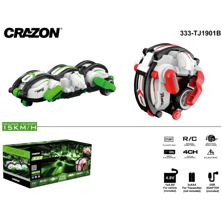 Enjoy Some amazing flips, spins and rolls with the new CRAZON 2.4ghz Stunt Rolling RC Model Car - High speed - 4 Channel and all tumbling stunt rolls you can handle!